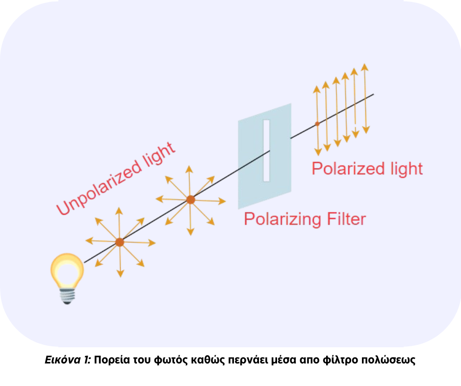 Όταν το φως αντανακλάται από τέτοιες επιφάνειες, γίνεται “πολωμένο”, δηλαδή κατευθύνεται περισσότερο σε μια συγκεκριμένη γωνία, δημιουργώντας έντονη λάμψη που ενοχλεί τα μάτια. Οι πολωτικοί φακοί λειτουργούν με την τεχνολογία φίλτρου, το οποίο μπλοκάρει αυτές τις αντανακλάσεις, επιτρέποντας μόνο το κάθετα πολωμένο φως να περάσει μέσα από τον φακό (εικόνα 1). Έτσι, το αποτέλεσμα είναι μια πιο καθαρή, άνετη όραση χωρίς λάμψεις και αντανακλάσεις.